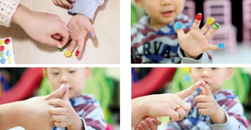3、把手指偶分别戴在宝宝的双手上,并使小动物的顺序一致。