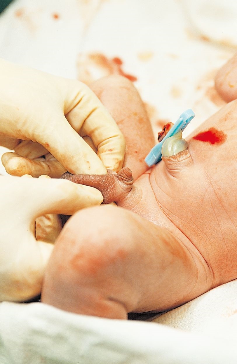 通过肚脐夹子外的脐带血管来确认新生儿血管是否正常。可以看到两根动脉和一根静脉。