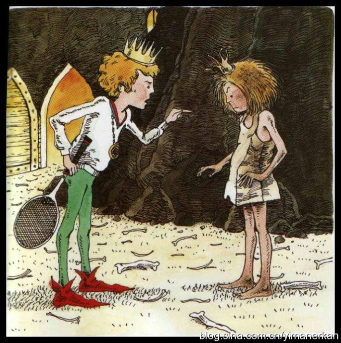 纸袋公主:“哎呀,雷诺,你的衣服很整齐漂亮、发型也不错、还打着网球,你看起来就像个真正王子,事实上,你却是一个只注重外表的家伙,我可不要嫁你呢”