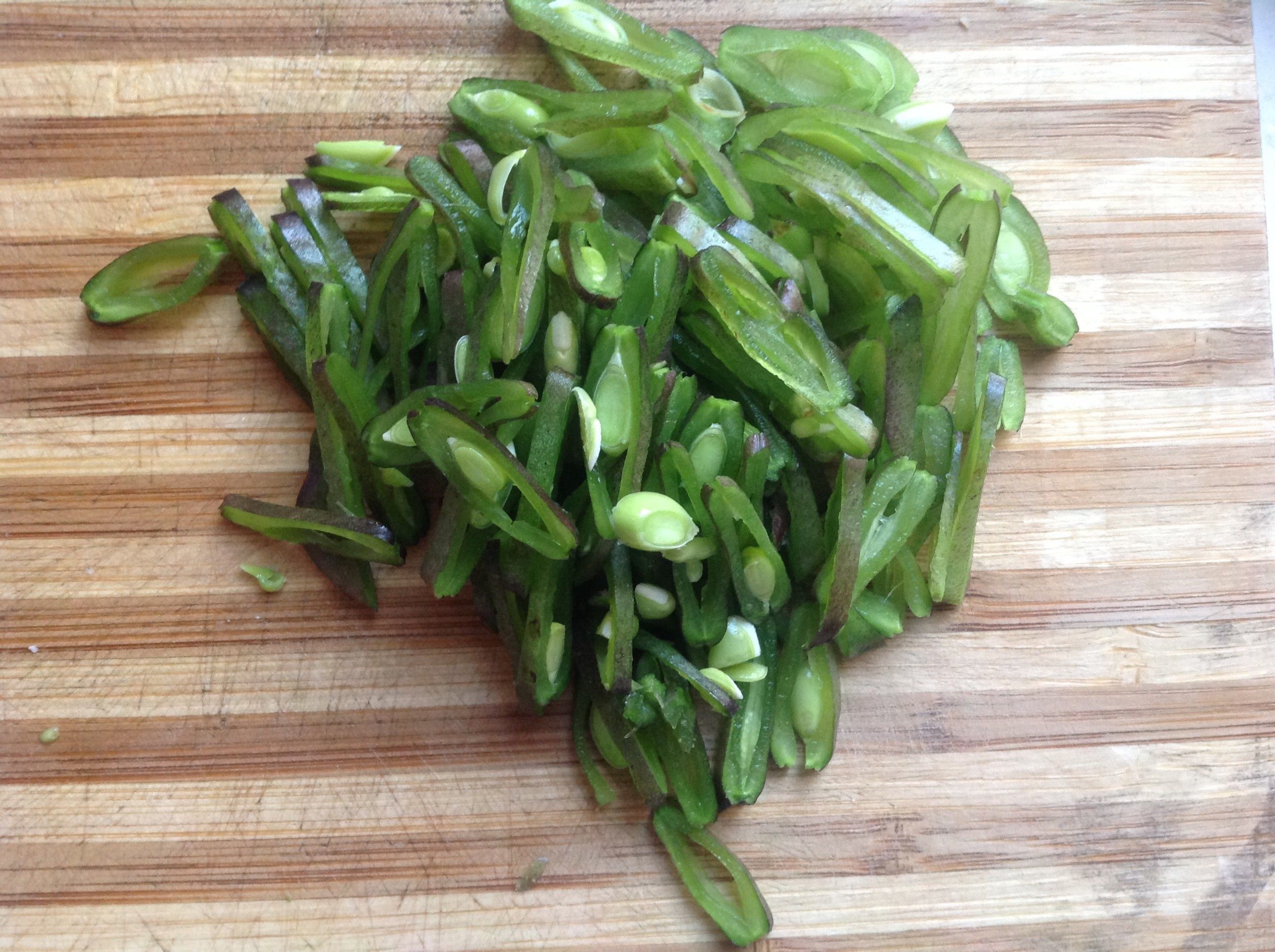 1.扁豆5片摘去两侧的筋。