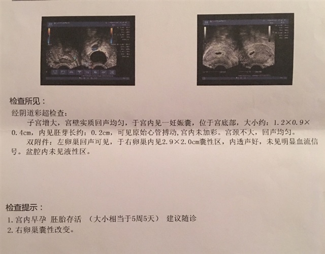 海霞:我今天41天,检查出来有卵黄囊,没胎芽胎心。流褐色分泌物,小腹疼,hcg35367 孕酮大于40