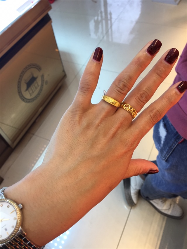 我带了好几年的一个黄金戒指,😂😂,因为跟老公当初是谈恋爱,就买了一对,后来订婚买了个钻戒,没怎么带过,因为更爱当初在一起时一起买的黄金戒指,舍不得摘,后来逛街也买过几次各式各样的,貌似就成了摆设,然后前阵子买了结婚戒指,婚礼用的什么各种首饰,我还没领证办婚礼,只是订婚,祝福你们喽,幸福快乐