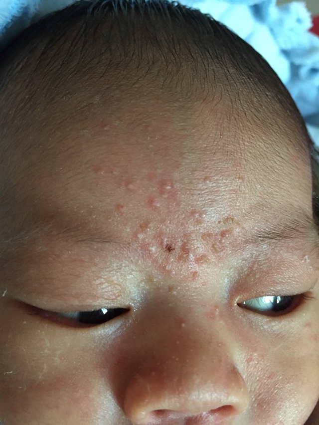 湿疹,我宝宝月子里满脸都是,还很红,每天保持皮肤干燥清爽,不要用手碰,不要捂太厚,母乳的话饮食清淡,最好别自己买药,一般药物都有激素的,对宝宝也不好,出月子慢慢就好了,