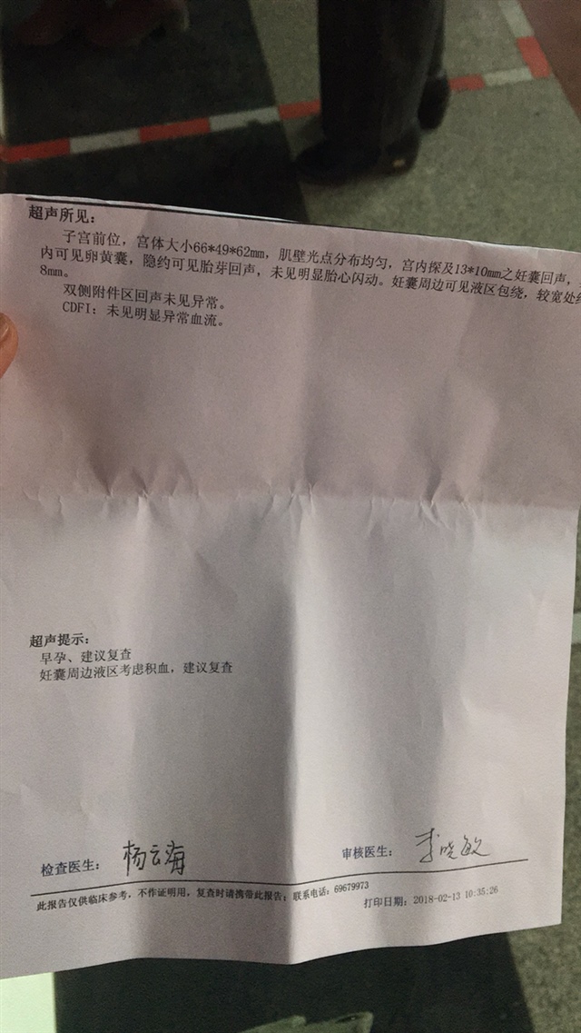 哈拉[帖主]:拖你吉言,医生说看孕囊像是五周左右,但是我按末次月经是七周,不过周期一直不准,月经老是后错