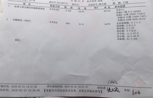 你的孕酮比较低,HCG值应该看看会不会翻倍