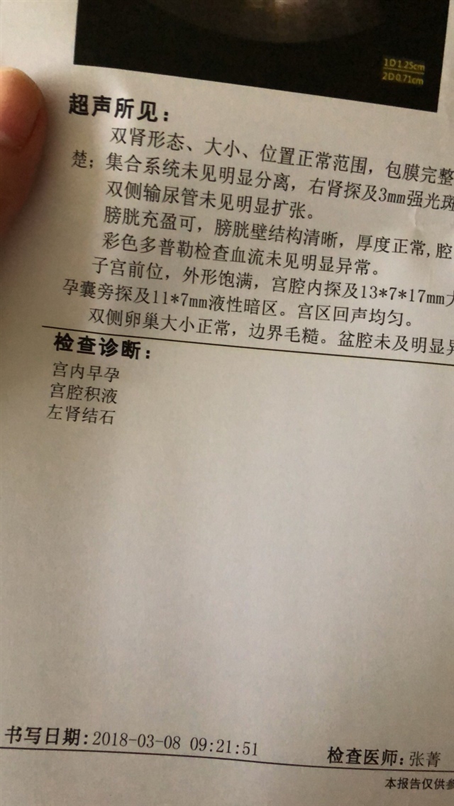 我是45天上完厕所厕纸上有一滴血,去医院做了b超显示有宫腔积液,后来过了一周去复查积液就没了。医生说积液后面都会没有的,应该是着床的时候和子宫内膜产生的血