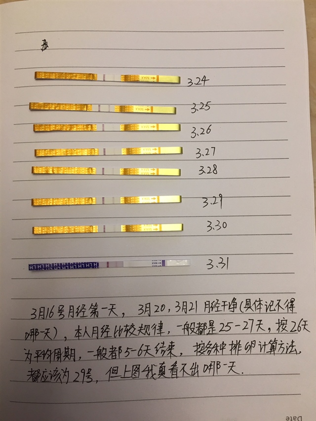 米粒姐姐[帖主]:也是在月经干净后的第四天开始测的,就3.25感觉接近点,但我觉得还是第二条线浅,而且时间上不对,不可能月经干净五天就排卵吧