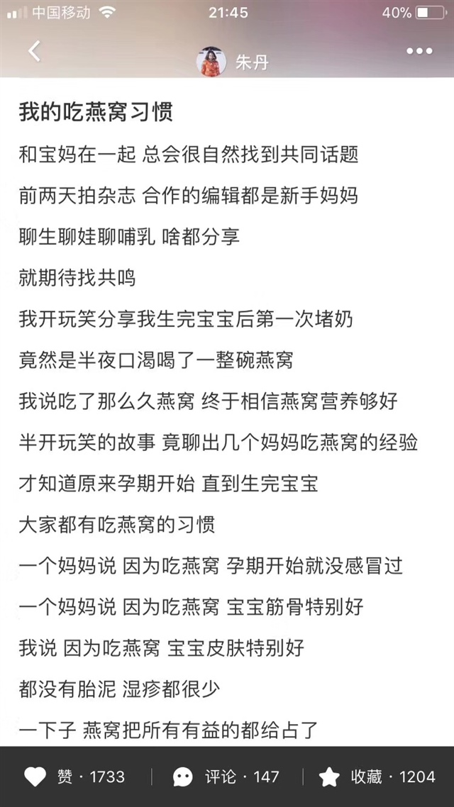 张靖云[帖主]:你朋友吃过燕窝吗 ?帮助宝宝智力发育 提高抵抗力 这些都是很好的动力哟 亲爱的