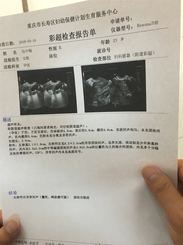 我当时也查出有5.5×4的囊性包块,起初也吓得要死,后来再去查,就小了,医生说怀孕初期很有可能是怀孕引起的,不必太担心,只能定期复查观察