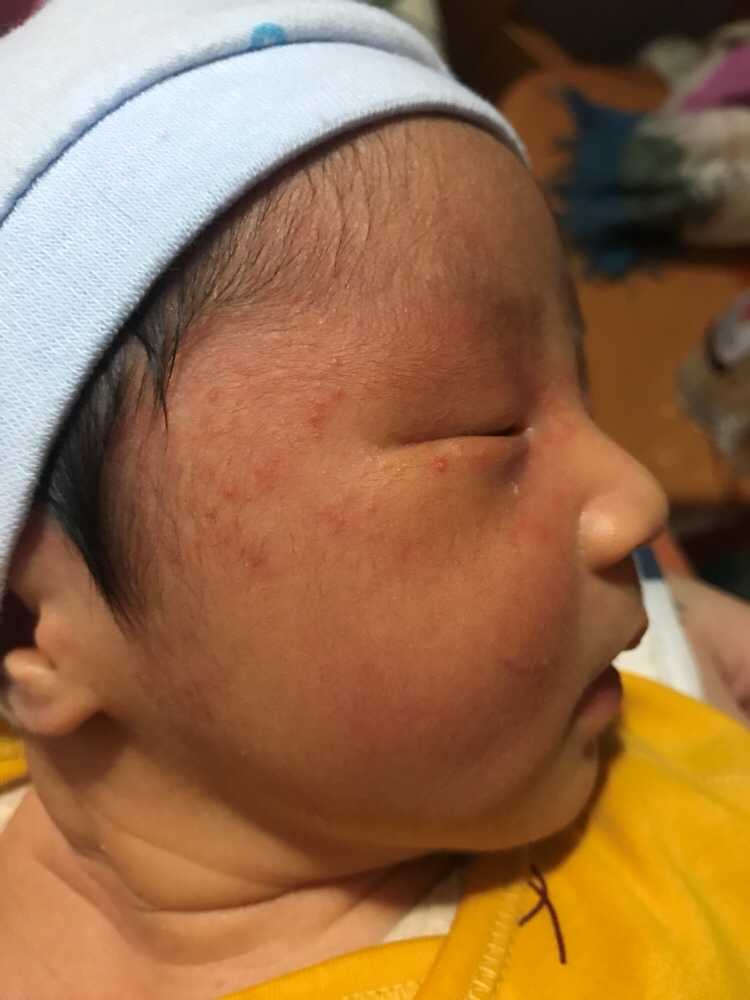 闷出来的吧,都出汗了,我大宝12月坐月子都不戴帽子,在家又不出去吹风