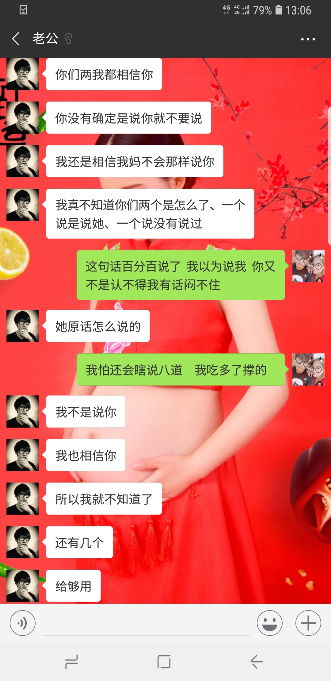靠 和我老公一模一样 我没有坏心 就有的时候嘴快说说 实际我婆婆人还蛮好 可我一说我老公就说我婆婆 我婆婆就可委屈了 。。。我就好尴尬 我现在很多事能憋着就憋着 和他说了很多次没多大事别老和你妈怼 他改不了 我现在大肚子在娘家我妈上班 他姐姐在坐月子我婆婆去照顾了我老公一个电话过去说你现在不来照顾你儿媳妇生宝宝也不用来了。。醉鸟