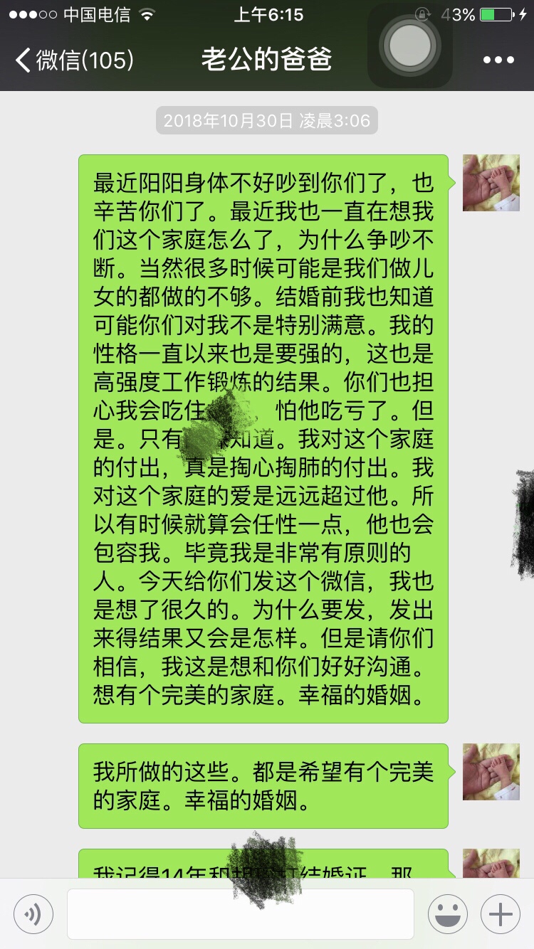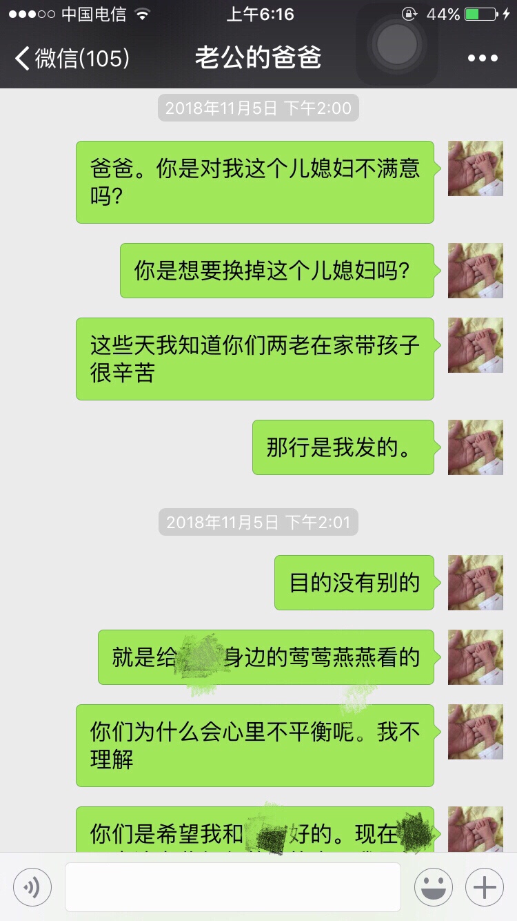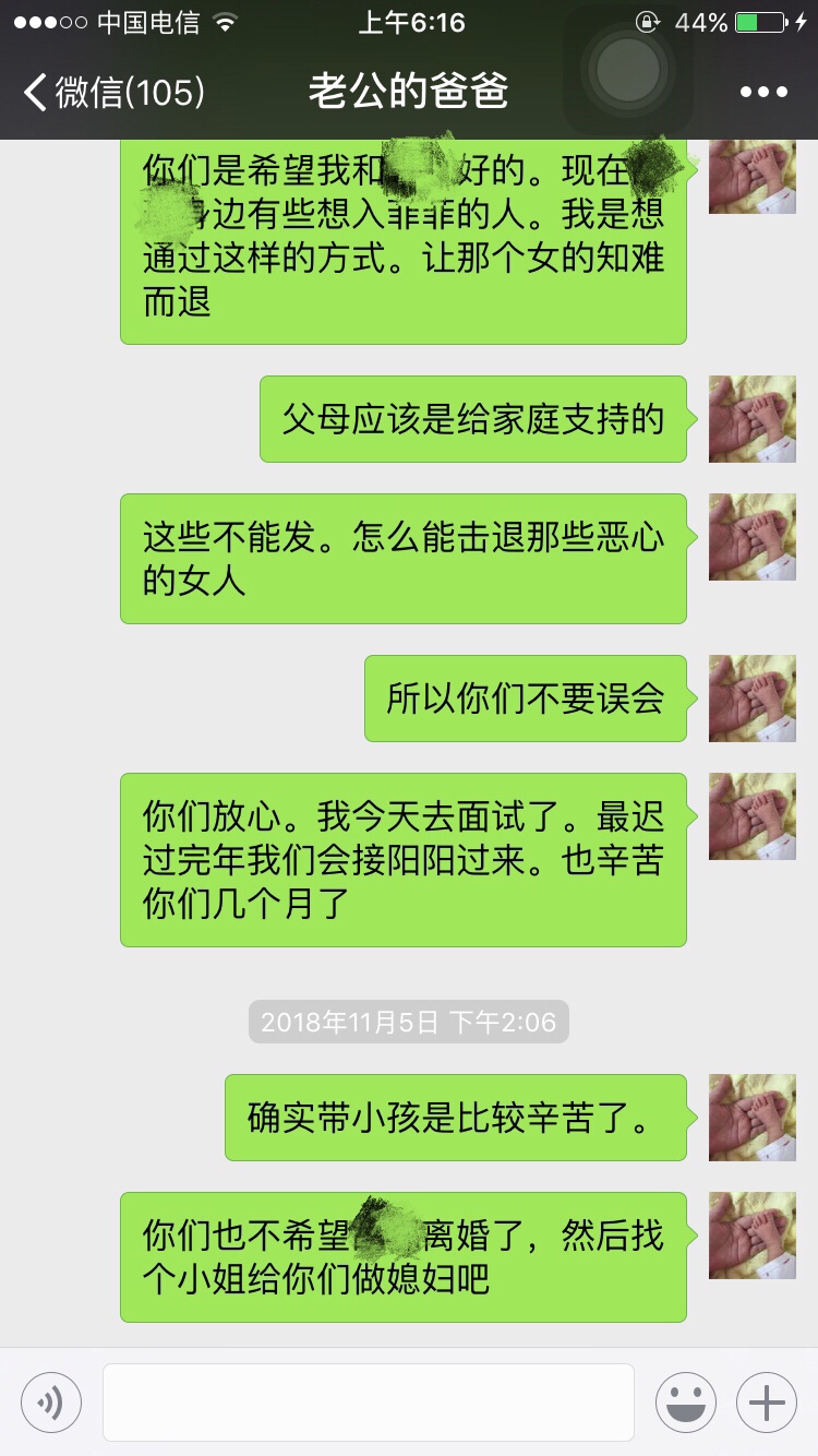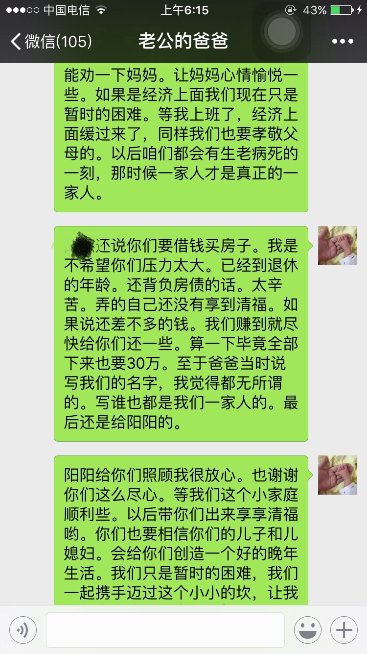 从你给你公公婆婆发的信息当中就听出了你的卑微,你的不强硬,你给他们俩活了大辈子的人干嘛讲那么多忍让的道理?我看他们也不是那种明事理,明尊卑的人物…这样只会得逞了他们心里认为你就是这种地位,这种不越界限不愿太难堪的儿媳妇,真心没必要像写作文一样发那么多心灵鸡汤,有的父母不领情的…或者说他们不吃这一套。你原本是有资本的,一手好牌被自己打的稀烂!