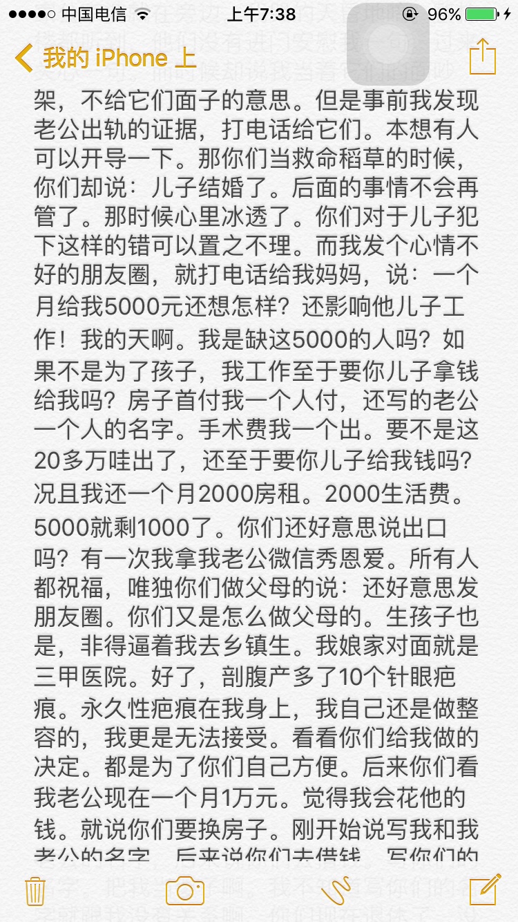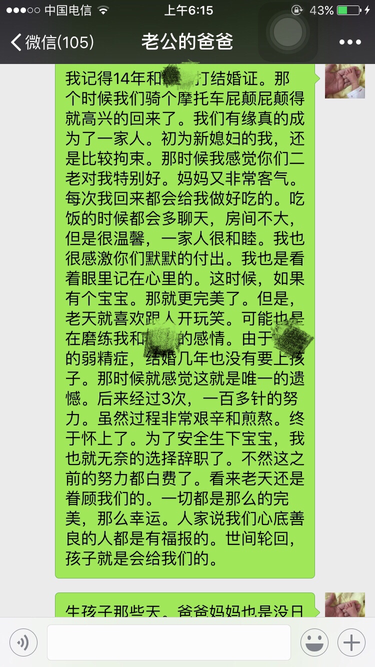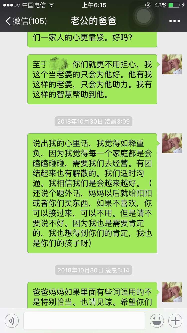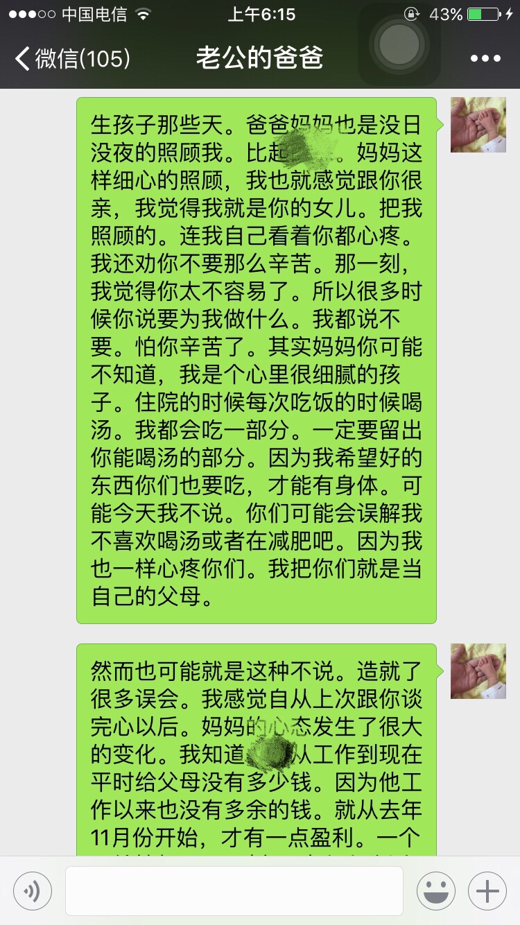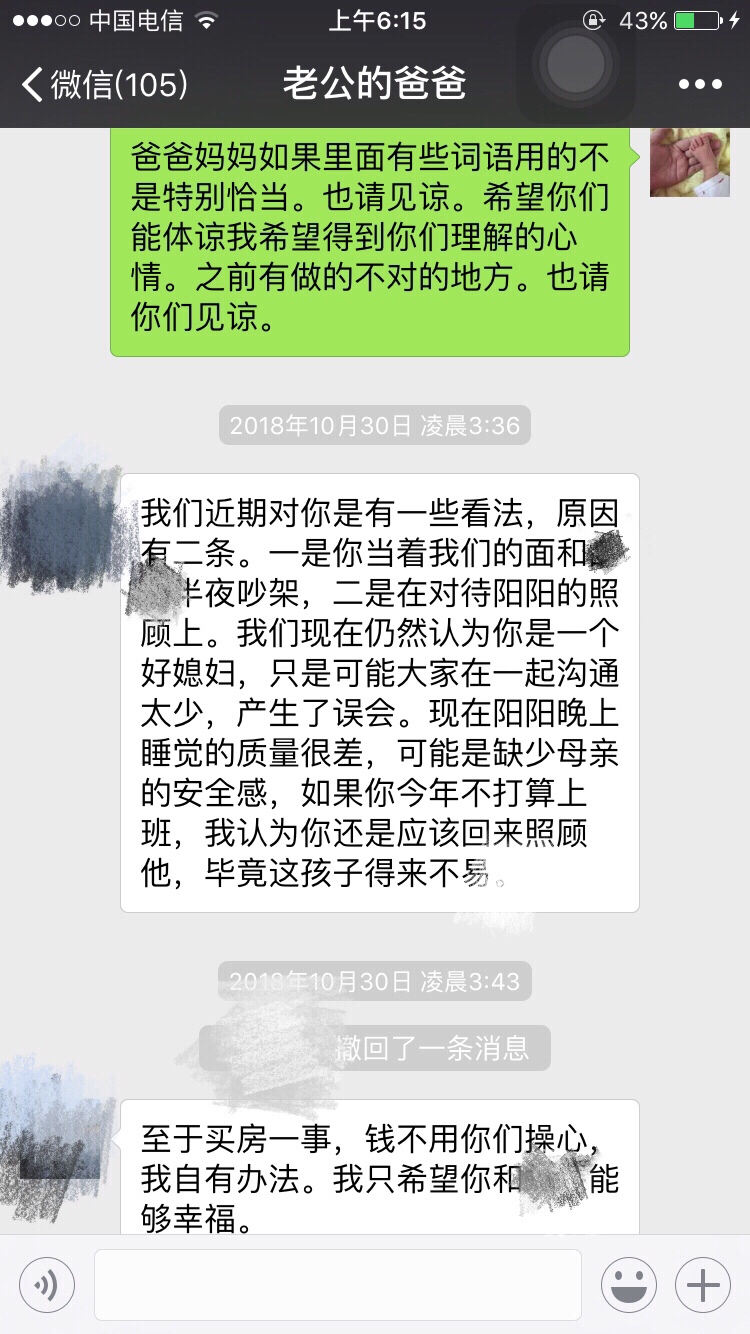 从你给你公公婆婆发的信息当中就听出了你的卑微,你的不强硬,你给他们俩活了大辈子的人干嘛讲那么多忍让的道理?我看他们也不是那种明事理,明尊卑的人物…这样只会得逞了他们心里认为你就是这种地位,这种不越界限不愿太难堪的儿媳妇,真心没必要像写作文一样发那么多心灵鸡汤,有的父母不领情的…或者说他们不吃这一套。你原本是有资本的,一手好牌被自己打的稀烂!