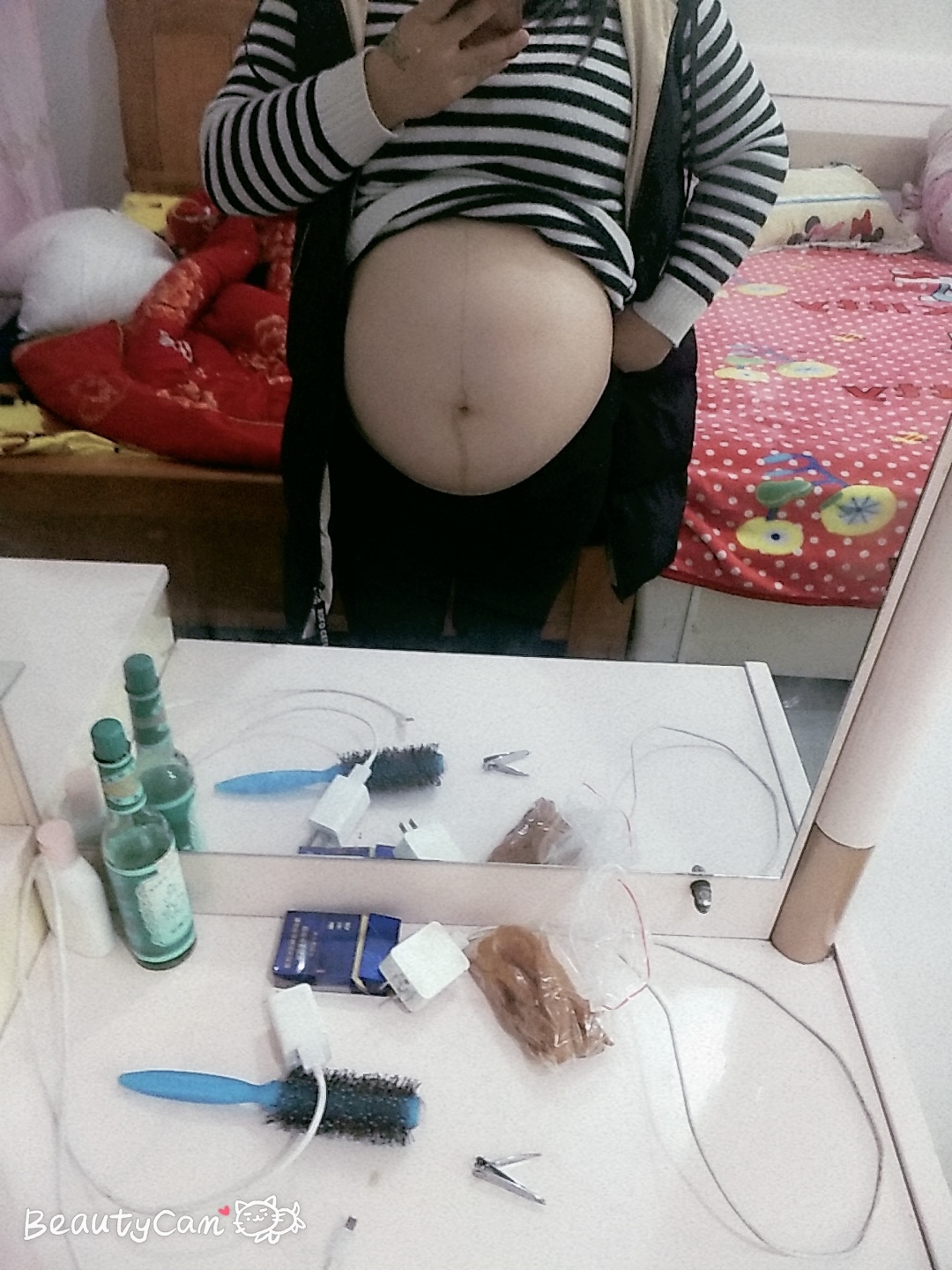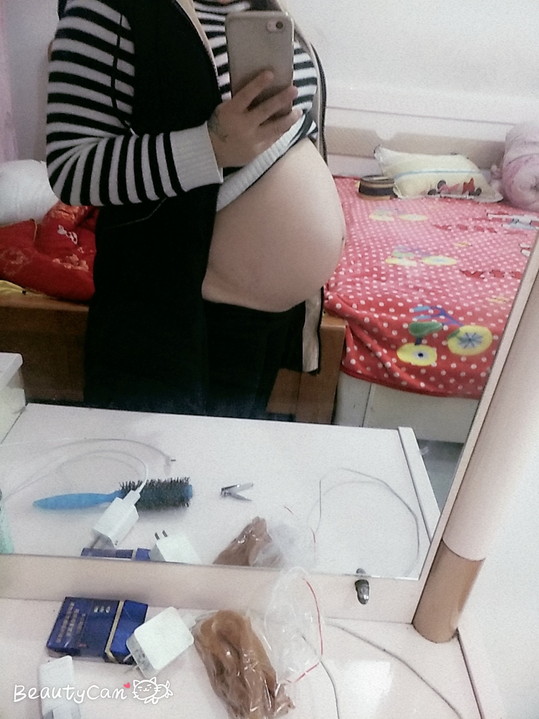 和我的肚子很像,我也这么大,肚子下面的妊娠线歪哈哈哈;晚上睡觉翻身都困难,而且耻骨疼。