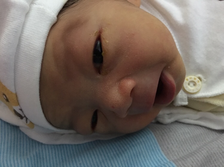 你现在应该是在坐月子吧,就暂时不要去医院,因为有的宝宝在42天左右会自动好,你可以在家里多做泪囊管按摩,具体手法是像做眼保健操一样,可以去百度一下,如果42天之后还没有好就去医院让医生看下!