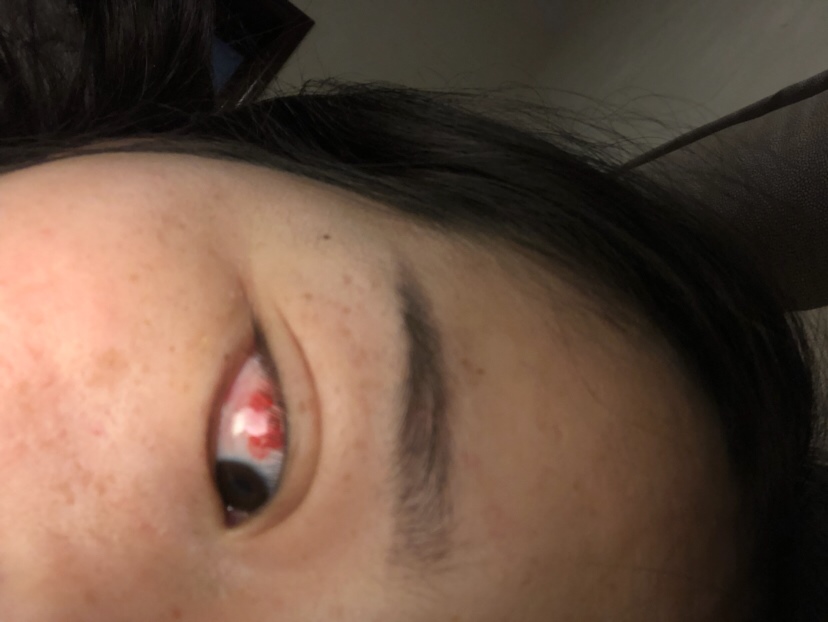 球结膜下出血 眼球表面毛细血管破裂 没关系 不会影响视力 淤血会慢慢吸收 但是你这个出血点在上方 可能会因为重力的作用往下扩散 现在也不好用药 不要揉眼睛 不要用眼过度 会好的