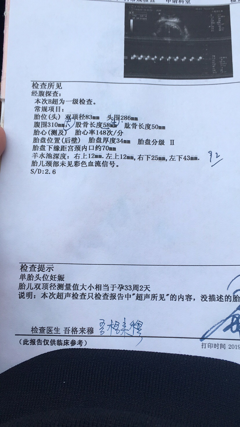 我31周➕4的数据:双颈定8.3cm, 腹围27,股骨长6.4cm,彩超孕周是32+2, 你的好像偏小点,多补补