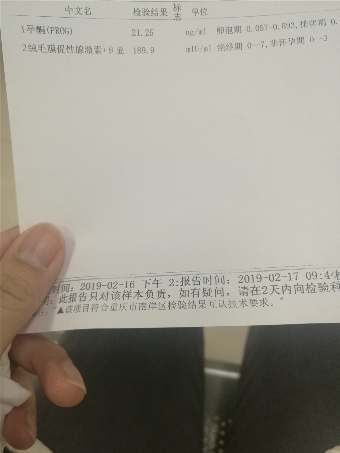 上上签[帖主]:我月经1月13来19号完,这是2月16查血的结果,多大了我也不知道,今天月经推迟4天,不会算多大了,你会看吗