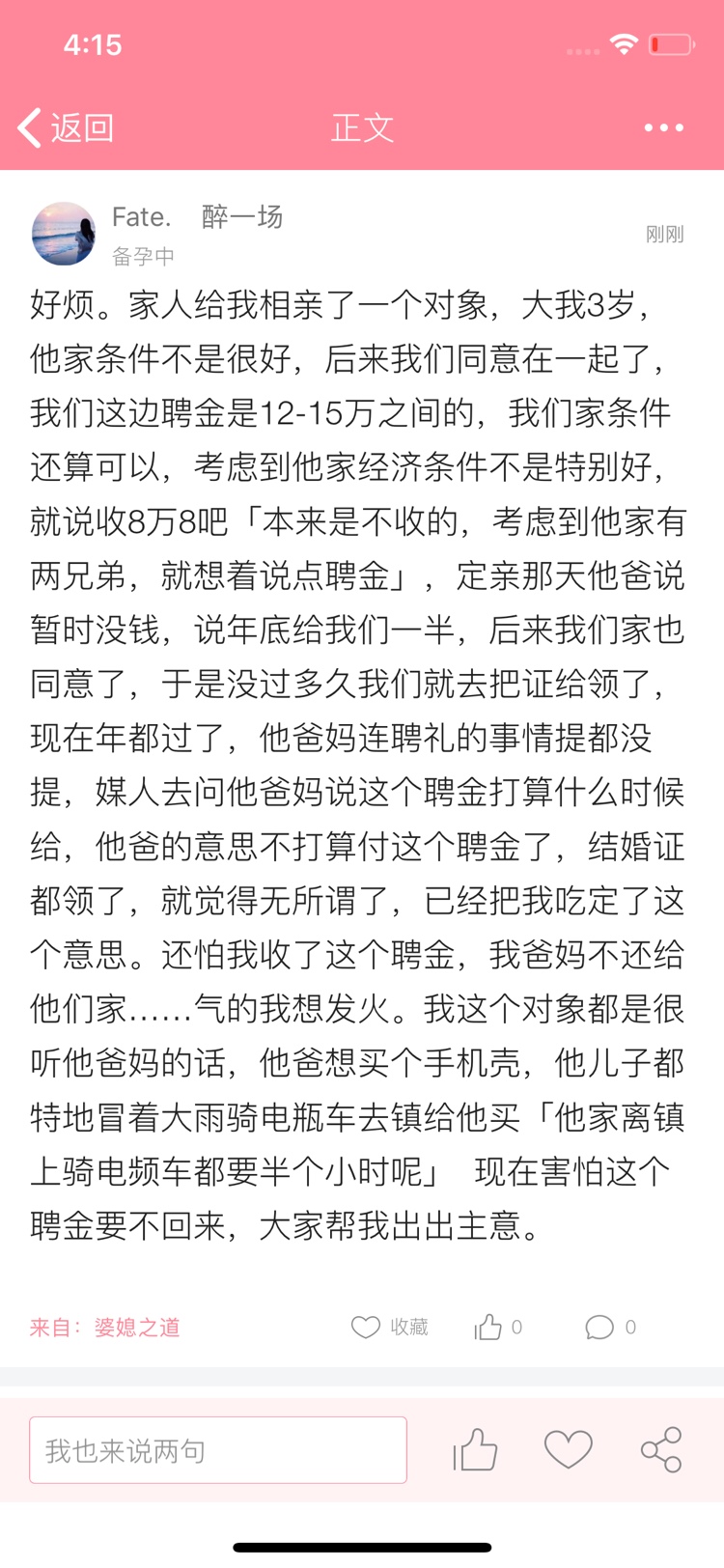 Fate. 醉一场[帖主]:我对象说他家没钱,叫我们别跟他爸妈说聘金的事,他自己想办法去凑钱……媒婆告诉我妈妈说:他爸不想给这个聘金了,认为我们两已经领证了,就觉得无所谓了,感觉吃定了我一样
