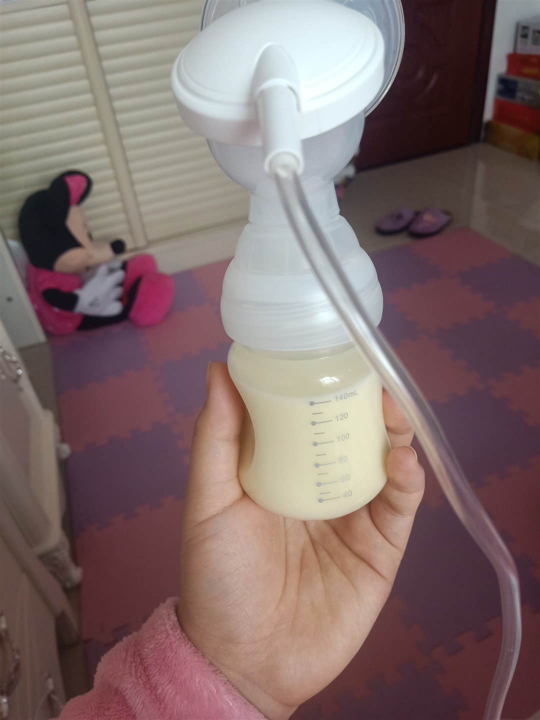 和你一样啊,真烦人,隔两小时间不寄出来就涨的痛,宝宝又喝不完,每天都要挤掉3/4杯倒掉。