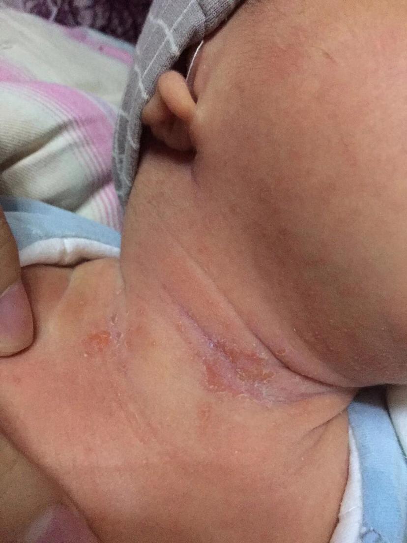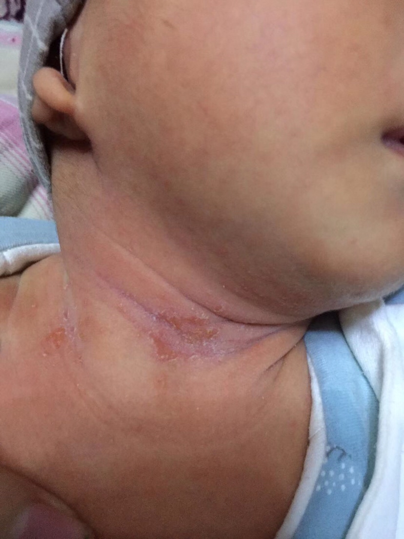不能用爽身粉,淹脖子,要注意清洗干净,水洗后用干口水巾把脖子褶皱蘸干,每天晒晒太阳露一下脖子。宝宝身上的其他地方褶皱都可以这样操作,另外可以擦点红霉素眼膏。