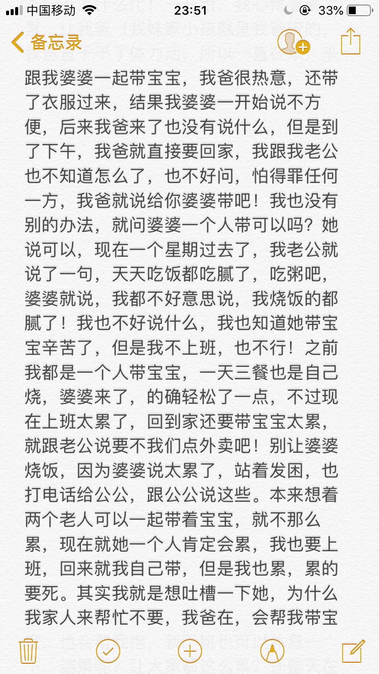 大宝贝[帖主]:主要不是自己爸爸妈妈,又担心她累了,身体累坏了,因为她经常跟公公说她累死了,也是在我们面前说的,弄的我们不知道怎么弄