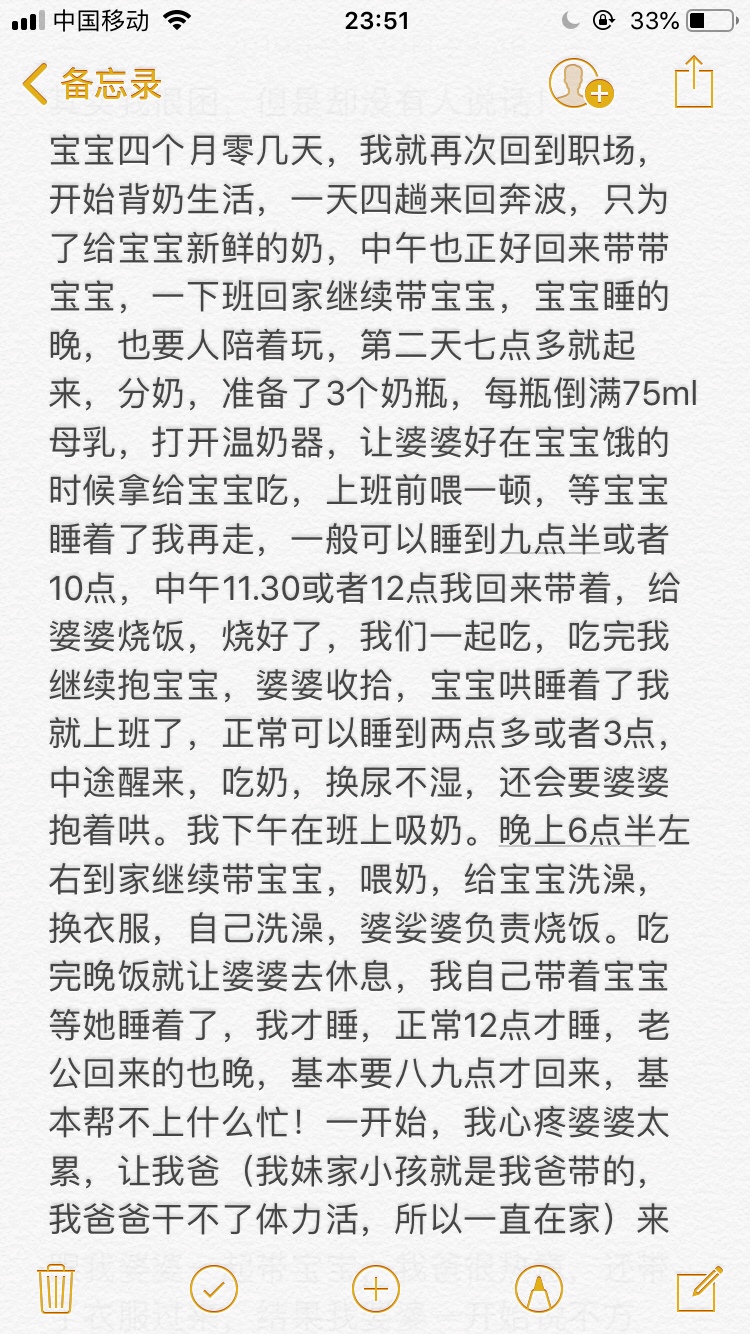 只怕你这样熬着身体熬坏了!婆婆一个大活人带孩子有什么累的,四个月很好带了除了吃就睡,也不用下地陪着玩