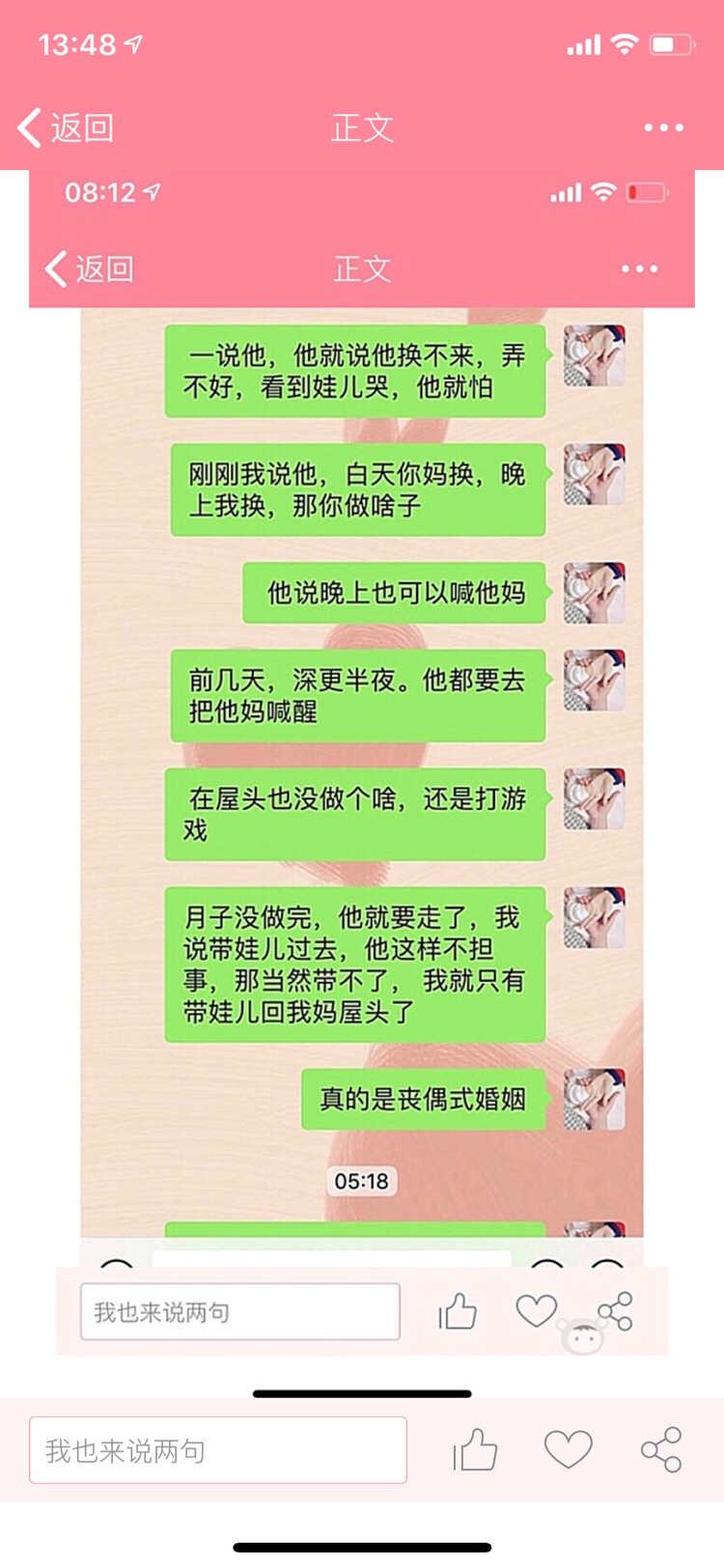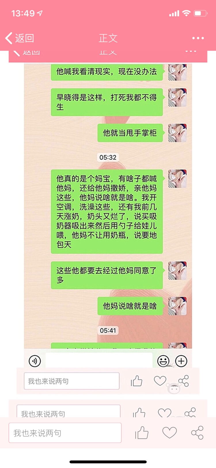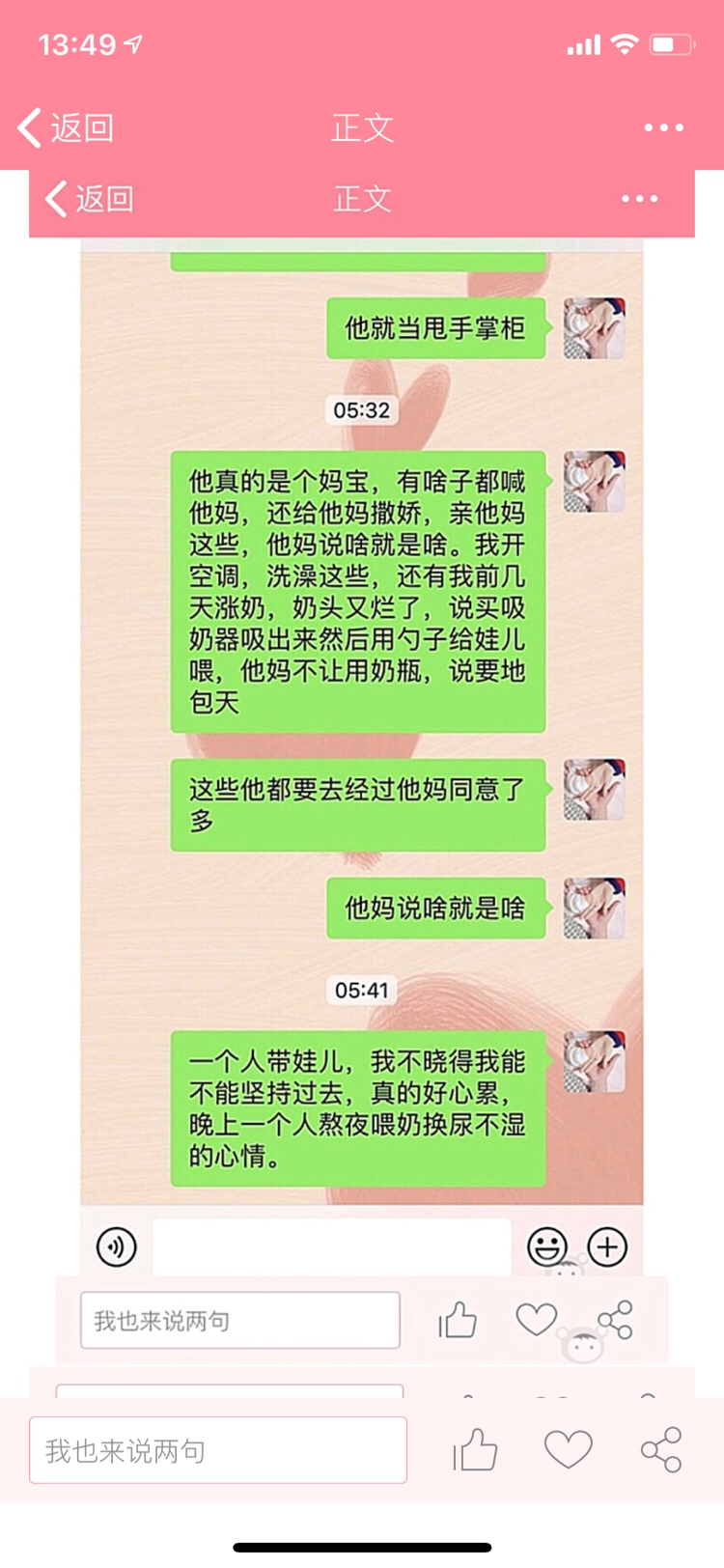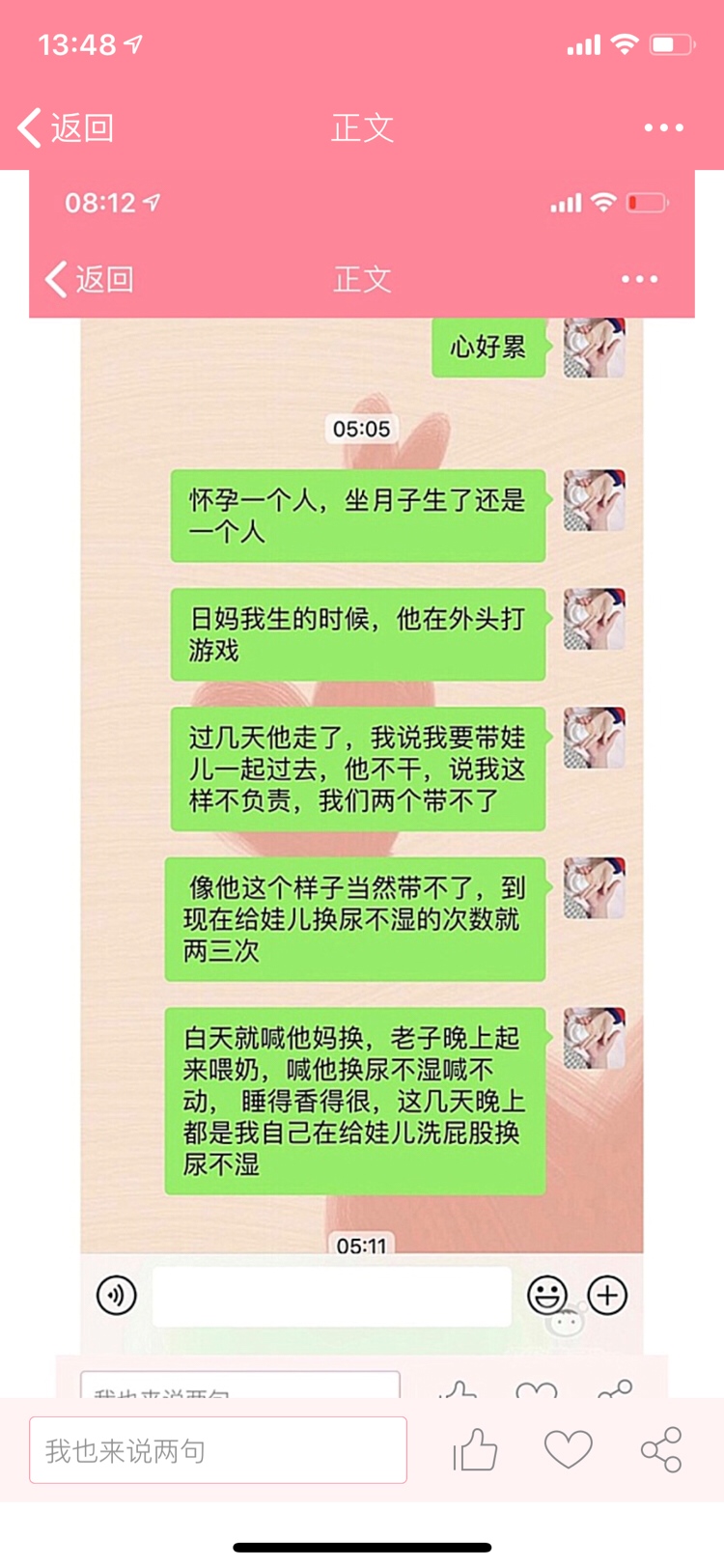 哎,女人最怕的不是辛苦,而是希望有位体谅,能有担当一起帮忙带带孩子的,心疼老婆的男人,我大宝三岁,在过一个月二胎双胎就要出生了,我是跟我老公还有婆婆说让婆婆带一个,我带大宝跟那个小的,不然怎么带的了,一个都累的要死,更何况两个,老公也只有20天陪产假
