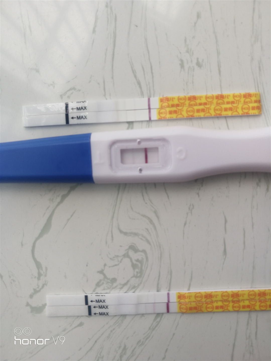 我也明天大姨妈日,前5天验孕棒测出来,前4天去抽血