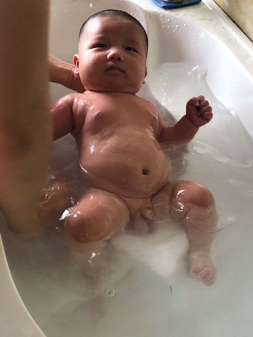 我家宝宝两个多月才给他游泳的。以为会怕会哭。结果游的可开心了。哈哈。也是超级喜欢洗澡澡