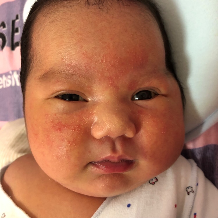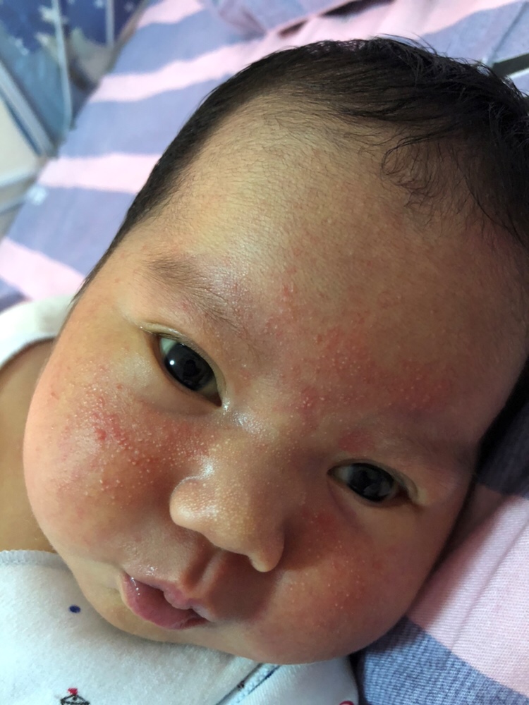 我家儿子母乳过敏 脸上就起这种一片一片的小颗粒 但他还伴随拉水的症状。 去医院查了三次才查出来。给孩子勤洗澡 开空调降温试试 还不行的话 儿研所的肤乐霜和艾洛松 3:1的比例擦一下 两天就下去了。
