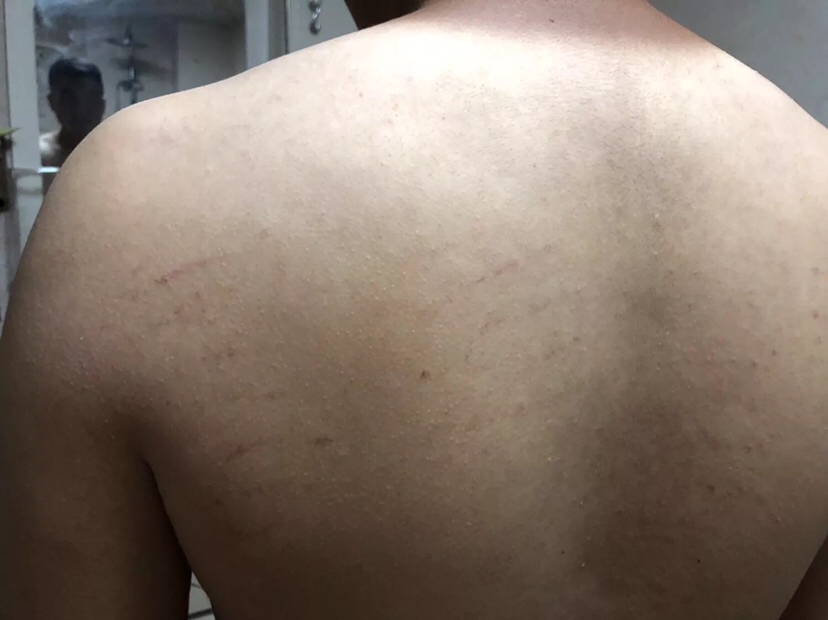 我老公周末陪闺女下海游泳上来后全身都是一条一条的,有时候洗澡也会