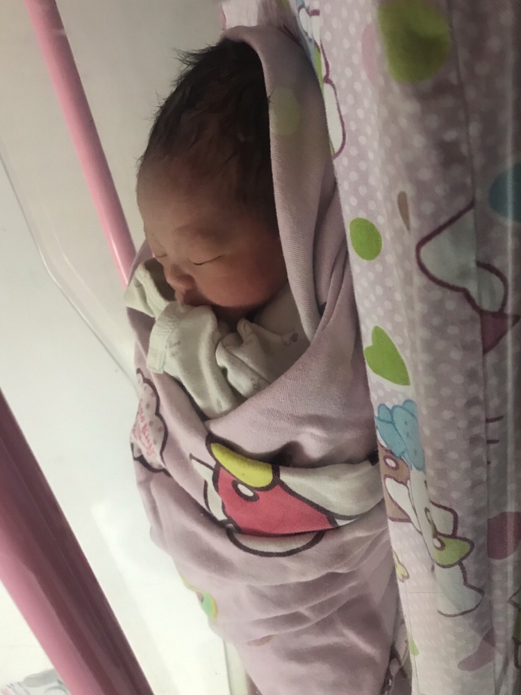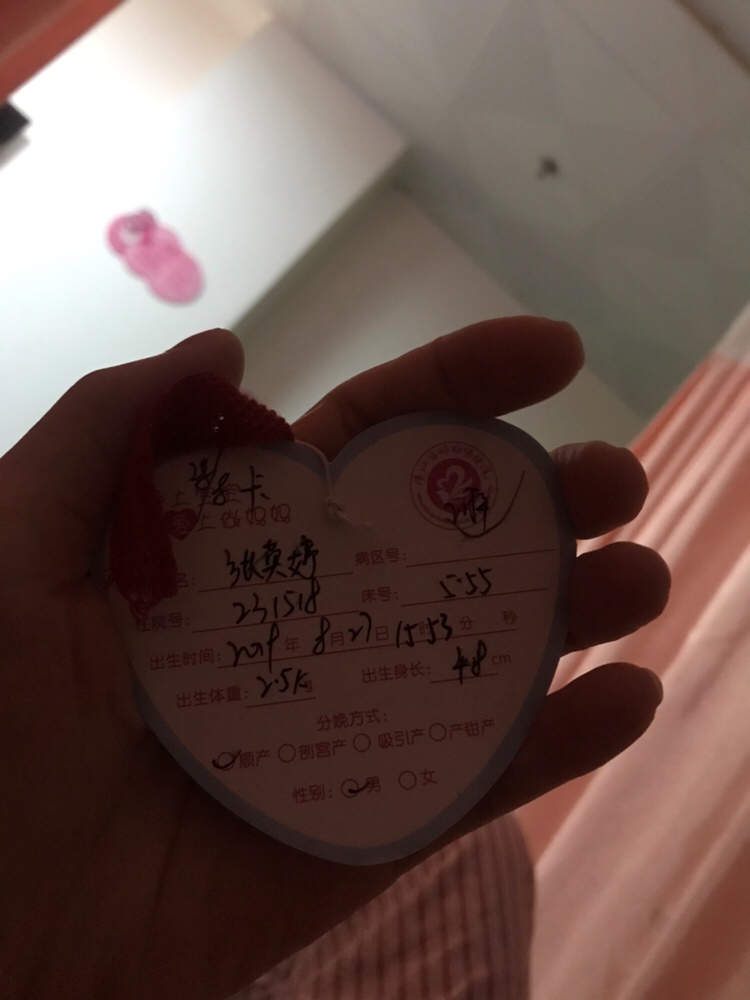 来报喜啦,记录📝这一刻:2019.8.27(农历:2019.7.27)15.53分终于迎来了我家猪宝宝🐷,生之前的这两天是不忍回忆的两天,虽然有做好了心里准备,但是比想象的还要痛苦上千百倍,8.26日复查胎监还是不好,做B超羊水74,偏小,马上安排住院待产,中午住院,做身体检查做了整整一个下午,医生👩⚕️说现在不能再等了,怕羊水少,要尽快安排催产,到了晚上🌃7点多做水囊催产,目的是为了软化宫颈,促进宫缩,导致宫颈开,塞水囊进入的过程中非常痛,塞进去一会就开始有反应,宫缩开始了,肚子开始痛起来,👩⚕️说前一个钟是最难受的,好不容易熬过了这一个小时,是缓解了一下痛,休息了一会,吃了个晚饭,但是万万没想到,过了一会,肚子又开始痛起来,痛一会停一会又痛一会,反反复复,有规律的宫缩,就这样让我从晚上8点多开始痛到早上6点,才不痛了,本想着这么痛,应该有效果,到了7点多吃了早餐,8点进产房拆水囊,因为我的宫颈很后又窄,一起进去3个女孩,人家早就拆完了,一个二胎的湖南女孩宫颈开了3公分,一个一胎很胖的女孩开了一公分,只有我,两个医生轮流帮我检查宫颈都说很后检查不了,后来叫了产科主任帮我弄,那滋味真的是只有一个字,痛,很痛,说我的效果是最不理想的,说宫颈虽然成熟了,但是只薄了一层,还有一层没破,别说开了,但是医生勉强让护士记录开一公分,接着医生跟我说,你不是没机会(顺产),可以试一下,可能过程会长一点,不行再刨,当时一下子心都凉了,接着做胎监,过了一个小时,开始三个女孩一起打催产素再一次进行催产开宫口,才刚打完没一分钟,我右边的胖女孩就开始痛的大叫起来,说一会一会的剧烈痛,她还问我,你不痛吗?我说一点都没有,过了又好一阵,我左边的二胎女孩也开始痛了一起说好痛,这下子心有点慌了,真的好怕催产素没反应,到时候还是要刨腹产,那真的生孩子的所有痛都要经历一遍,接着我问医生,为什么只有我一点反应都没有,我好怕,哪怕一点点痛都好,医生还笑着说,你还想痛啊,你要趁现在不痛好好睡一下,要不然等下没力气生,等下痛起来你不要喊痛哈。紧接着还是没反应,一个小时后,医生检查左边的二胎女孩,人家宫口已经开到了5. 6公分,医生说效果不错,二胎女孩开了2公分,我的还是1公分,后来有人需要床位,问谁的没那么快就先出去,毋庸置疑是我,换房间到了待产房,后来又问了两次医生,为什么我的一点反应都没有,是不是需要加大药,医生让我睡一会,说我说话都没力气太虚了,问完本想着睡一会,因为太困了,已经两个日夜没睡了,过了有半个小时,肚子开始痛了起来,痛醒了,一开始还能忍,后来宫缩越来越密,越来越不能忍受,护士说忍不了跟她说打无痛,心想着再忍忍,因为无痛的有效时间是十几个小时,我怕打了十几个小时过后我还没生怎么办,接着又忍了一阵,握着老公的手,痛死来就拽他,后来实在受不了,让护士检查宫口,结果才开1.5公分,护士说一般开了2公分就可以打无痛了,老公说忍不了我们1.5也打,我说不,我要再忍忍,又忍了一会实在痛的受不了,哭着说,我不管了,我要打针了,结果护士推着我进产房打针,进去之后还等了半个钟才打了,一会还是觉得痛,医生说要十分钟才有效,过了感觉好久还是觉得痛,后来医生帮我加大了药剂,这下舒服得呀,一点感觉都没有了好舒服,无痛真的是女性的福音,心想着我可能要明天后天才能生了,因为宫颈开的实在太慢了,我就开始不知不觉睡着了,不知道过了多久,阴道右侧开始有点痛,就醒了,因为还能忍受就没叫护士,然后就听到护士说右边的胖女孩宫口快开全了十公分了,准备生产,接着就一直听到医生在喊用力深呼吸,然后医生说,跟你一起进来的那个女孩,人家早上10点多就生了,当时我才知道,天啊,那个左边二胎湖南女孩早上就生了好羡慕,右边的也快了,只有我,还在漫长的等待之中,还不知何时,过了一会,护士帮我检查宫口,还是1.5公分,我当时都快绝望了,问医生,我还是只有1.5公分吗?医生说是,但是让我不要担心,催产素还是有效果的,虽然宫口还是1.5公分,但是宫颈薄了,接下来会很快的,我其实不太相信的,因为我的开实在太慢了,接着老公让护士送进来了牛奶和巧克力,我就喝了牛奶,吃了一点🍫,实在太饿了,早上吃了一点粥,直到当时已经下午2点多了,吃完过了一阵,阴道越来越痛,到后来实在觉得不行,太痛了就跟护士说让她看看,后来她去看了我的胎监,跑回来说胎监不好,接下找来了3个医生来到我面前说:你的情况很不好,胎心怎么只有几十,你这样不行啊,可能要马上准备刨宫产了,正常是110到160,吓得我都不知道什么反应了,接着一个医生👩⚕️赶紧帮我检查阴道,一打开,好惊讶的说,看到宝宝👶头了。