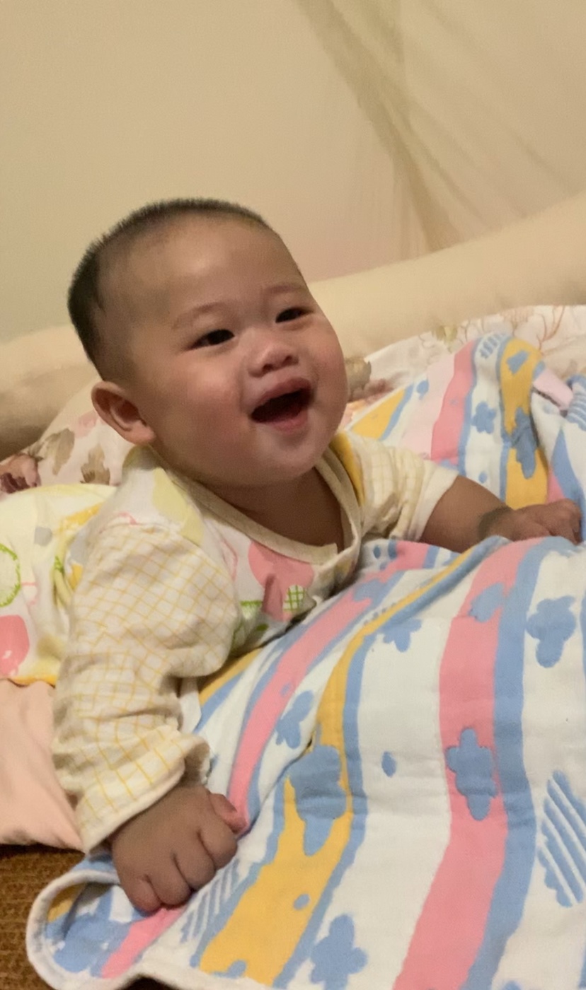 我自己带哈,宝宝睡到九点多哈哈😄四个多月长了三个小牙齿,也是翻身不停哈哈😄