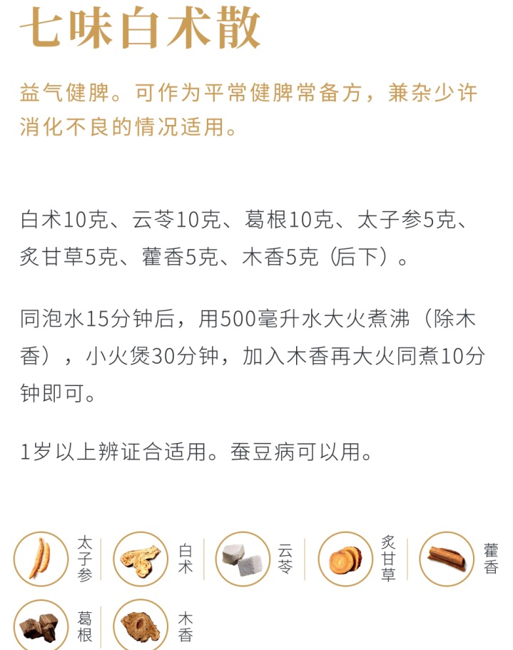 脾虚的孩子不能过度补充营养,不宜过饱。一旦出现积食的迹象,就要控制饮食,少量多餐,及时助消化。如果情况比较严重,喝了三星汤没有效果,可以喝四磨汤口服液,这个力度会比三星汤强一些,也可以给孩子吃七味白术散,补脾益气,调和脾胃。具体该怎么用,脾胃课里面有详细介绍,可以翻看一下。