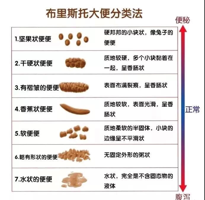 正常情况下,每天的食物经过消化、吸收以后,余存的废物变成大便排出体外,正常的大便应该干湿适中。光说大家没什么感觉,西医有个布里斯托大便分类法,将大便从干到湿分为7种类型,最中间的就是正常的大便,我觉得很清晰,可以给大家一个参考: