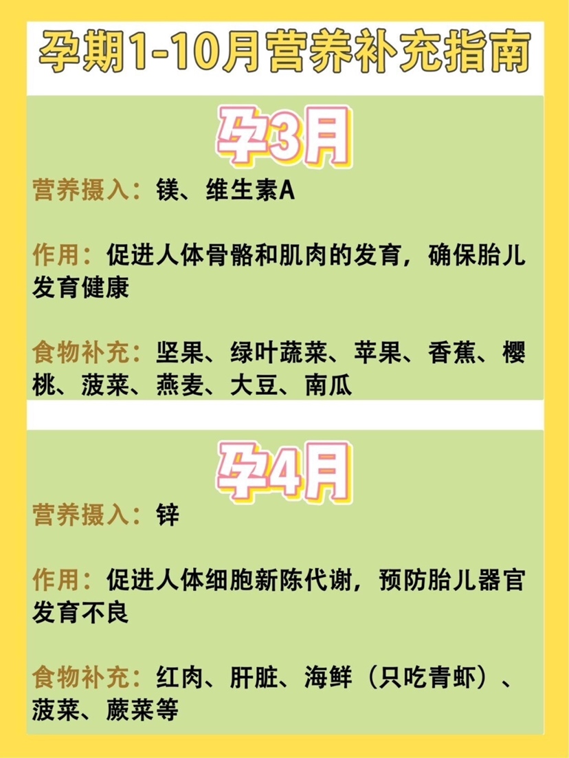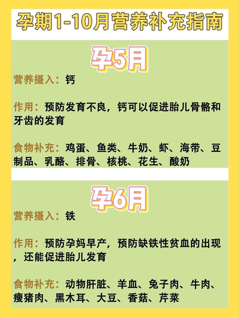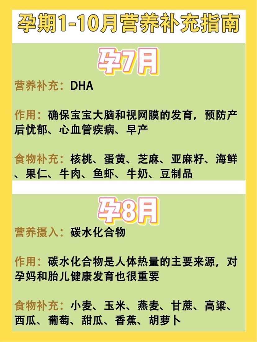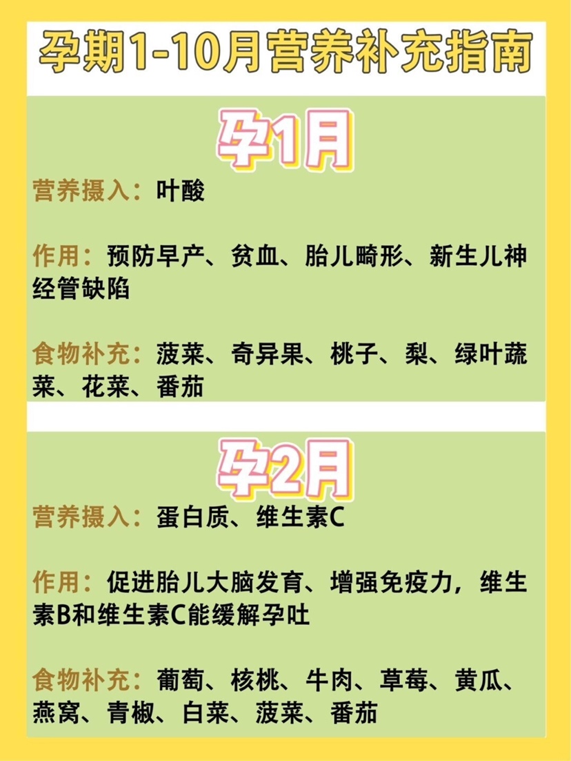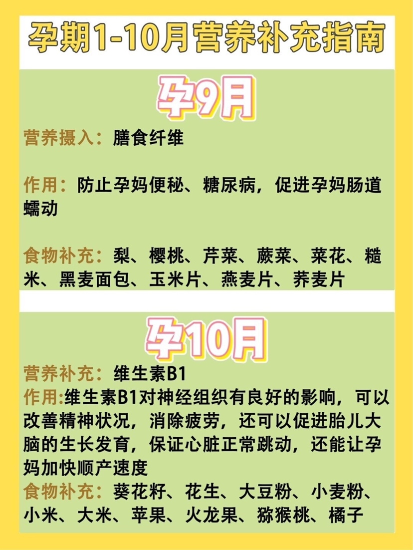 孕妈须知|超全怀孕1-10月营养补充指南 🌟怀孕1个月 营养补充:叶酸 叶酸作用:预防早产、贫血、胎儿畸形、预防新生儿神经管缺陷 食物补充:菠菜、奇异果、桃子、梨、绿叶蔬菜、花菜、番茄 🌟怀孕2个月 营养补充:蛋白质、维生素C 蛋白质维生素C作用:促进胎儿大脑发育、增强免疫力,维生素B和维生素C能缓解孕吐 食物补充:葡萄、核桃、牛肉、草莓、黄瓜、燕窝、青椒、白菜、菠菜、番茄 🌟怀孕3个月 营养补充:镁、维生素A 镁维生素A作用:促进人体骨骼和肌肉的发育,确保胎儿发育健康 食物补充:坚果、绿叶蔬菜、苹果、香蕉、樱桃、菠菜、燕麦、大豆、南瓜 🌟怀孕4个月 营养补充:锌 锌的作用:促进人体细胞新陈代谢,预防胎儿器官发育不良 食物补充:红肉、肝脏、海鲜(只吃青虾)、菠菜、蕨菜等 🌟怀孕5个月 营养补充:钙 钙的作用:预防发育不良,钙可以促进胎儿骨骼和牙齿的发育 食物补充:鸡蛋、鱼类、牛奶、虾、海带、豆制品、乳酪、排骨、核桃、花生、酸奶 🌟怀孕6个月 营养补充:铁 铁的作用:预防孕妈早产,预防缺铁性贫血的出现,还能促进胎儿发育 食物补充:动物肝脏、羊血、兔子肉、牛肉、瘦猪肉、黑木耳、大豆、香菇、芹菜 🌟怀孕7个月 营养补充:DHA DHA的作用:确保宝宝大脑和视网膜的发育,还能减少产后忧郁,DHA可以改善老年痴呆、降低血脂,预防心血管疾病,还能预防早产 食物补充:核桃、蛋黄、芝麻、亚麻籽、海鲜、果仁、牛肉、鱼虾、牛奶、豆制品 🌟怀孕8个月 营养补充:碳水化合物 碳水化合物作用:碳水化合物是人体热量的主要来源,对孕妈和胎儿健康发育也很重要 食物补充:小麦、玉米、燕麦、甘蔗、高粱、西瓜、葡萄、甜瓜、香蕉、胡萝卜 🌟怀孕9个月 营养补充:膳食纤维 膳食纤维作用:防止孕妈便秘、糖尿病,促进孕妈肠道蠕动 食物补充:梨、樱桃、芹菜、蕨菜、菜花、糙米、黑麦面包、玉米片、燕麦片、荞麦片 🌟怀孕10个月 营养补充:维生素B1 维生素B1作用:维生素B1对神经组织有良好的影响,可以改善精神状况,消除疲劳,还可以促进胎儿大脑的生长发育,保证心脏正常跳动,还能让孕妈加快顺产速度 食物补充:葵花籽、花生、大豆粉、小麦粉、小米、大米、苹果、火龙果、猕猴桃、橘子